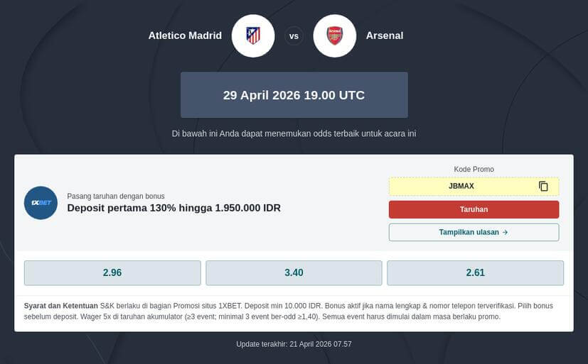 Bursa taruhan Atletico Madrid vs Arsenal kini menjadi topik panas di kalangan bettor Indonesia menjelang laga semifinal Liga Champions 2025/26 leg pertama. Berdasarkan data odds terkini, Arsenal sedikit lebih diunggulkan dengan odds kemenangan di angka 2,60, sementara Atletico Madrid dipasang di 2,97 dan hasil imbang di 3,40 — selisih tipis yang mencerminkan betapa ketatnya duel dua raksasa Eropa ini di atas kertas.