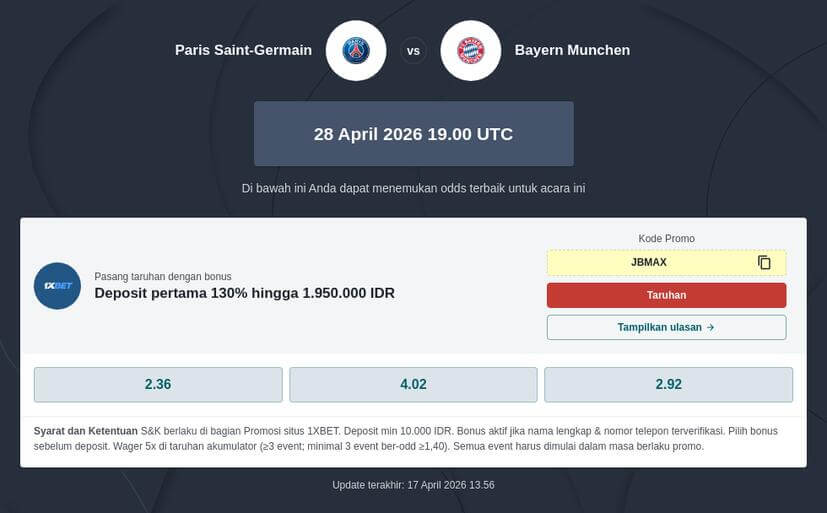 Bursa taruhan PSG vs Bayern pun langsung bergerak aktif begitu hasil draw semifinal diumumkan. Yang menarik, bandar menempatkan PSG sebagai favorit kandang dengan odds 2.35, Bayern di 2.92, dan seri di 4.04. Selisih yang tipis — pertanda laga ini benar-benar fifty-fifty di atas kertas. Sebelum memasang taruhan, simak analisis bursa PSG vs Bayern Munchen leg 1 secara lengkap berikut ini.