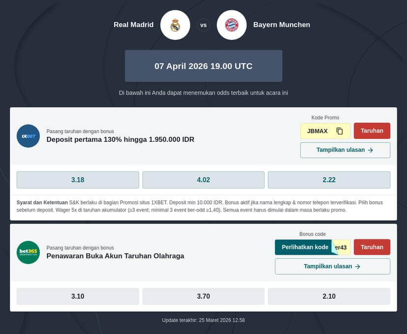 Berdasarkan data terbaru, bursa mengunggulkan Bayern Munchen dengan odds 2.22. Sementara kemenangan bagi Real Madrid berada di angka 3.18, dan hasil seri dipatok pada odds 4.02. Pertemuan epik dalam ajang perempat final liga champions musim ini kembali menyajikan "El Clasico" versi Eropa yang dinanti jutaan pasang mata.